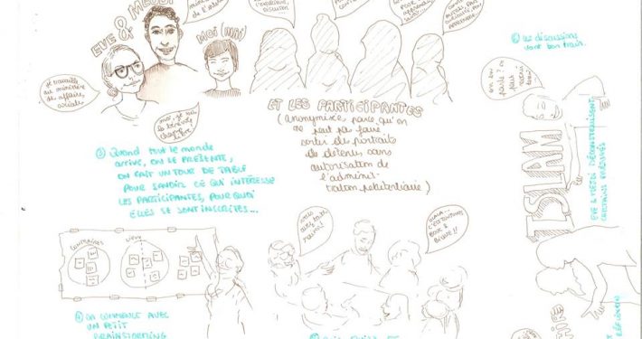 Les 4 samedi après-midi du mois d’avril, Eve et Mejdi (énarques et inspecteurs généraux des affaires sociales et intérieur) ont animé des ateliers de débats politiques pour les femmes du centre de détention de Réau. Quelques planches pour vous donner un aperçu des discussions animées autour des questions de laïcité, de travail et genre…